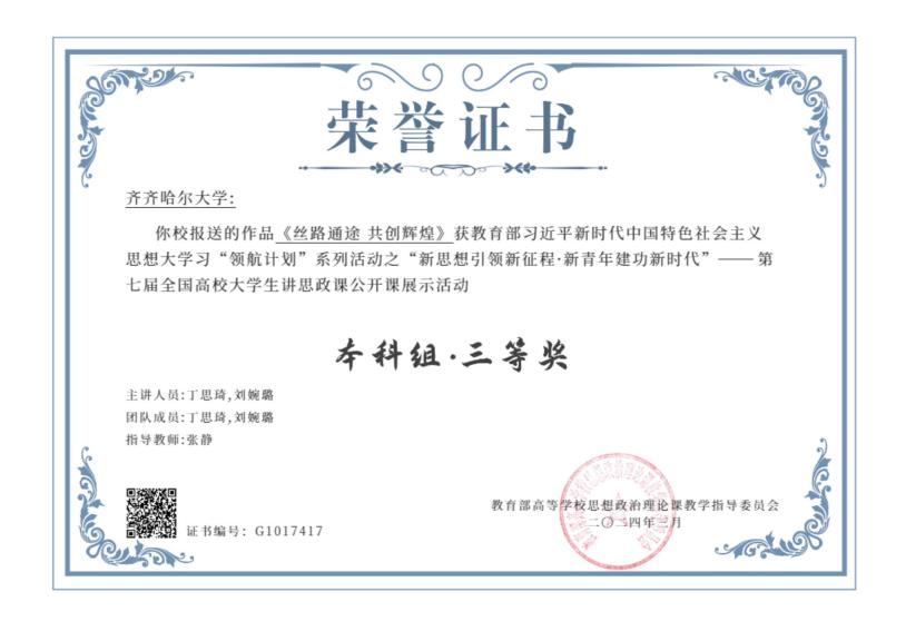 近日,由教育部高校思政课教学指导委员会主办,南开大学马克思主义学院承办的“新思想引领新征程•新青年建功新时代”——第七届全国高校大学生讲思政课公开课展示活动公布了评审结果。我校马克思主义学院张静教授指导的学生参赛作品《丝路通途 共创辉煌》荣获本科组三等奖。