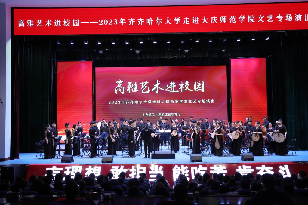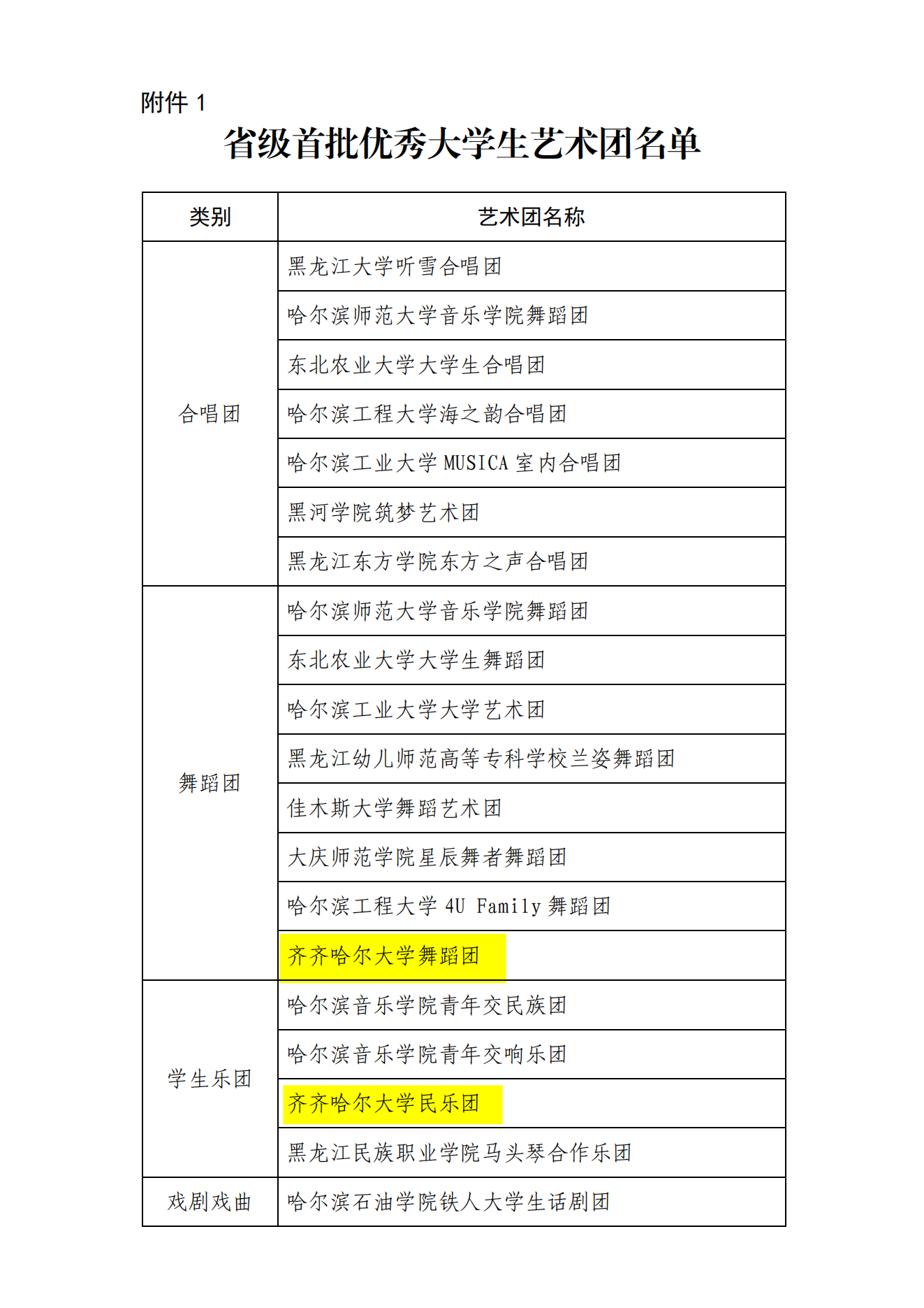 为深入贯彻《教育部关于全面实施学校美育浸润行动的通知》(教体艺〔2023〕5号)及《黑龙江省全面实施学校美育浸润行动工作方案》(黑教发〔2024〕22号)的决策部署,打造特色美育品牌、繁荣校园文化、丰富第二课堂、促进学校育人成效,在黑龙江省教育厅举办的首批优秀学生艺术团遴选活动中,我校舞蹈团和民乐团两个团队成功入选全省首批优秀学生艺术团。(全省共入选合唱团、舞蹈团、学生乐团、戏剧戏曲四类20个团队)