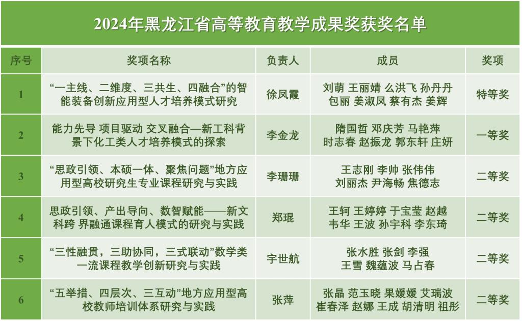 近日,黑龙江省教育厅发布了《关于公布2024年黑龙江省高等教育(本科、研究生)和职业教育教学成果奖获奖名单的通知》(黑教发〔2025〕5 号),我校共获奖6项,其中特等奖1项、一等奖1项、二等奖4项,实现了省高等教育教学成果奖特等奖零突破!