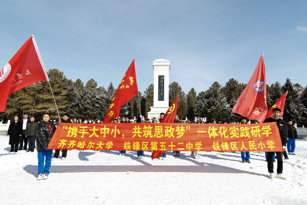 为深化大中小学思想政治理论课一体化建设,3月27日,学校《毛泽东思想和中国特色社会主义理论体系概论》课程开展社会实践活动,联合齐齐哈尔市人民小学、第五十二中学师生代表,共同赴西满烈士陵园开展了“携手大中小,共筑思政梦”一体化实践研学系列活动,此次活动以“赓续红色血脉 凝聚奋进力量”为主题,通过沉浸式实践教学,推动不同学段学生在红色教育中实现思想共鸣与精神共育。