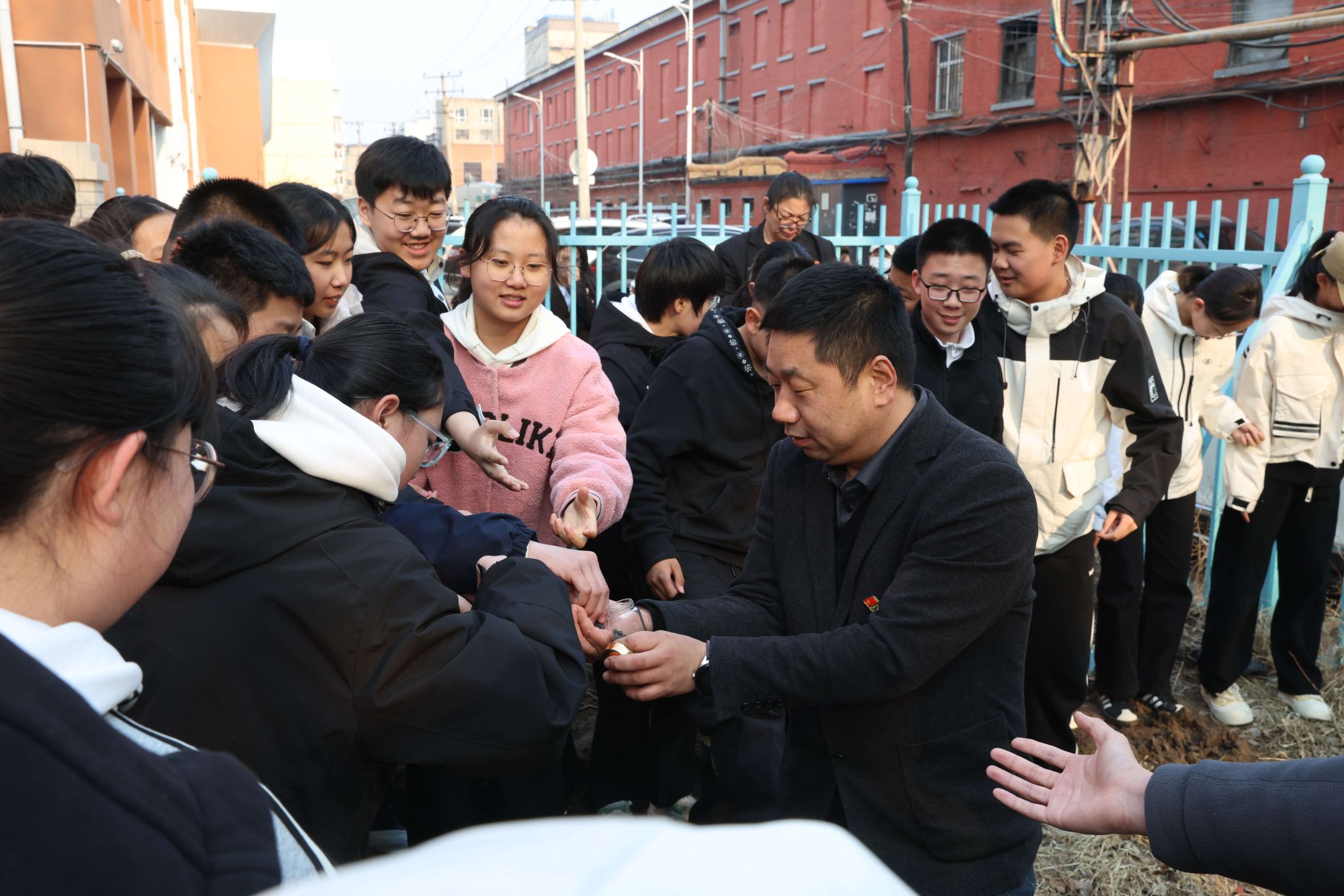 双方开展了“春种一粒种,秋收一片梦”实景大思政课主题实践活动。活动现场,化学与化学工程学院副院长时志春为同学们带来了一堂生动的科普课,介绍了牡丹花种子的生物学特性、种植要求,分享了牡丹花在药用成分提取、园艺品种改良等方面的重要科研价值。活动中,我校学生和中学生创新开展了“1+1”结对活动,在老师的专业指导下,共同开启“结对种植”实践,并在记录卡片上签下名字,写下种植心愿与目标。此项活动,打破了学段壁垒,大学生化身“研学小导师”带领中学生在实践中共话成长,在互动中传递责任与担当。