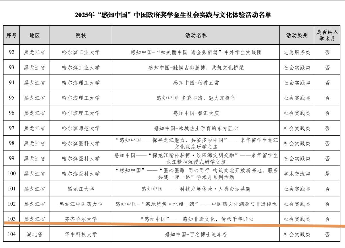 近日,国家留学基金管理委员会下发了《中国政府奖学金国际暑期学校项目计划下达通知》及《2025年“感知中国”活动方案批复》,我校申报的《齐齐哈尔大学-传统活化·智创未来暑期夏令营》《“感知中国”——感知非遗文化,传承千年匠心》2个项目通过评审。