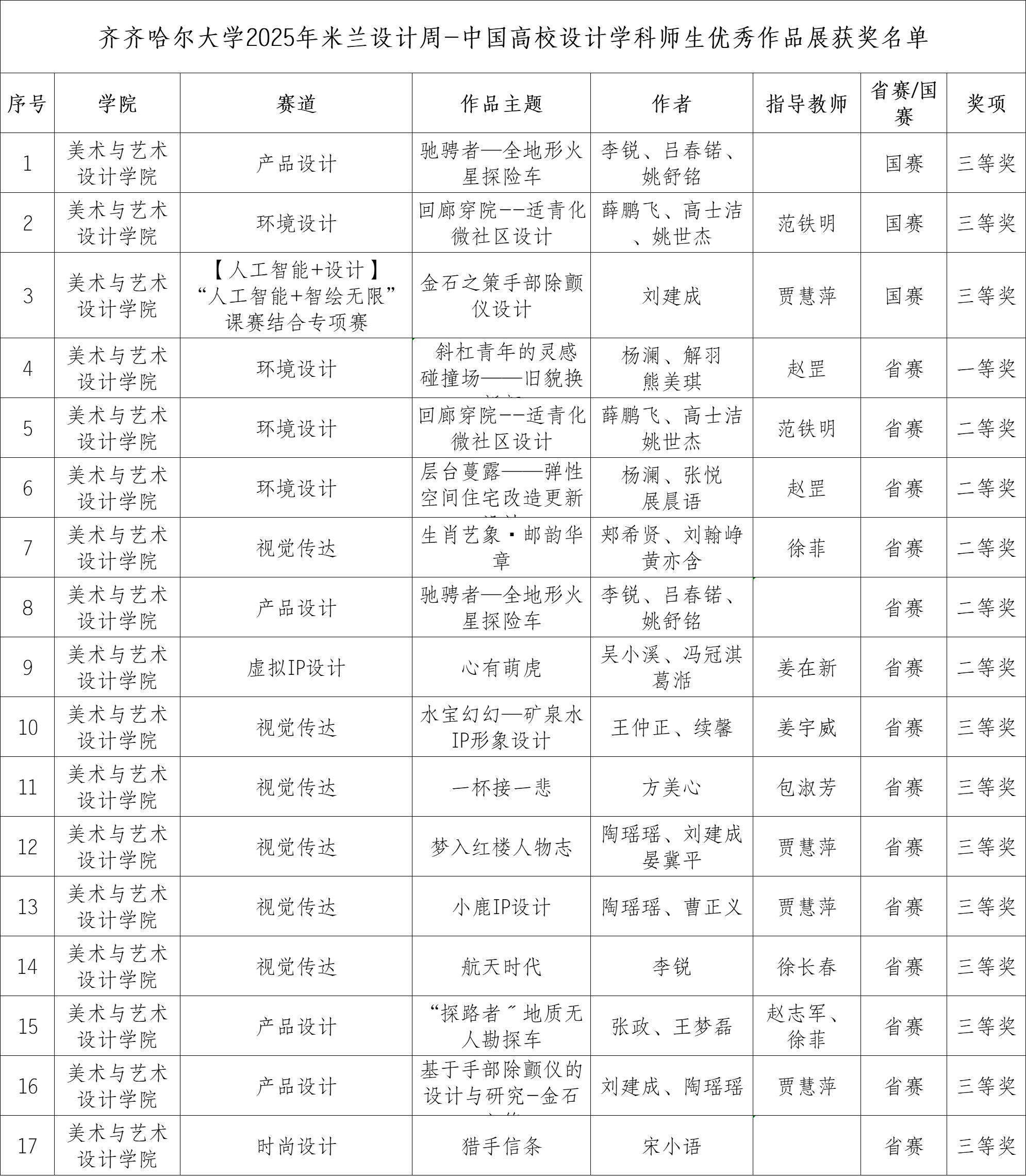 本次大赛取得的成绩彰显了我校“教赛融合、产教协同”的办学特色,是对设计学科教学质量与人才培养成效的充分肯定,也是学校深化教学改革、优化学科建设、精准对接我省“4567”现代产业体系中创意设计产业人才需求的成果体现。未来,学校将持续优化创新型设计人才培养体系,为龙江振兴提供坚实人才支撑。