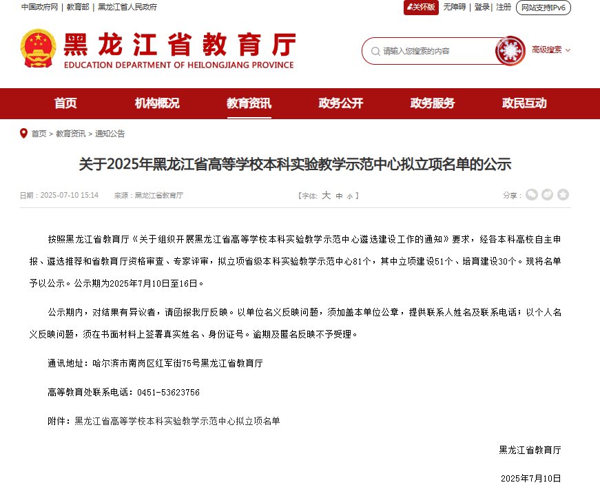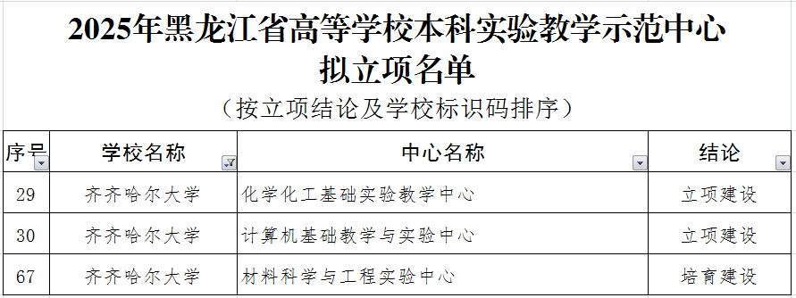 近日,黑龙江省教育厅对2025年黑龙江省高等学校本科实验教学示范中心拟立项名单进行了公示,我校申报的化学化工基础实验教学中心、计算机基础教学与实验中心获批立项建设,材料科学与工程实验中心获批培育建设。