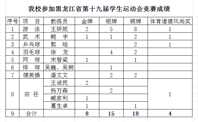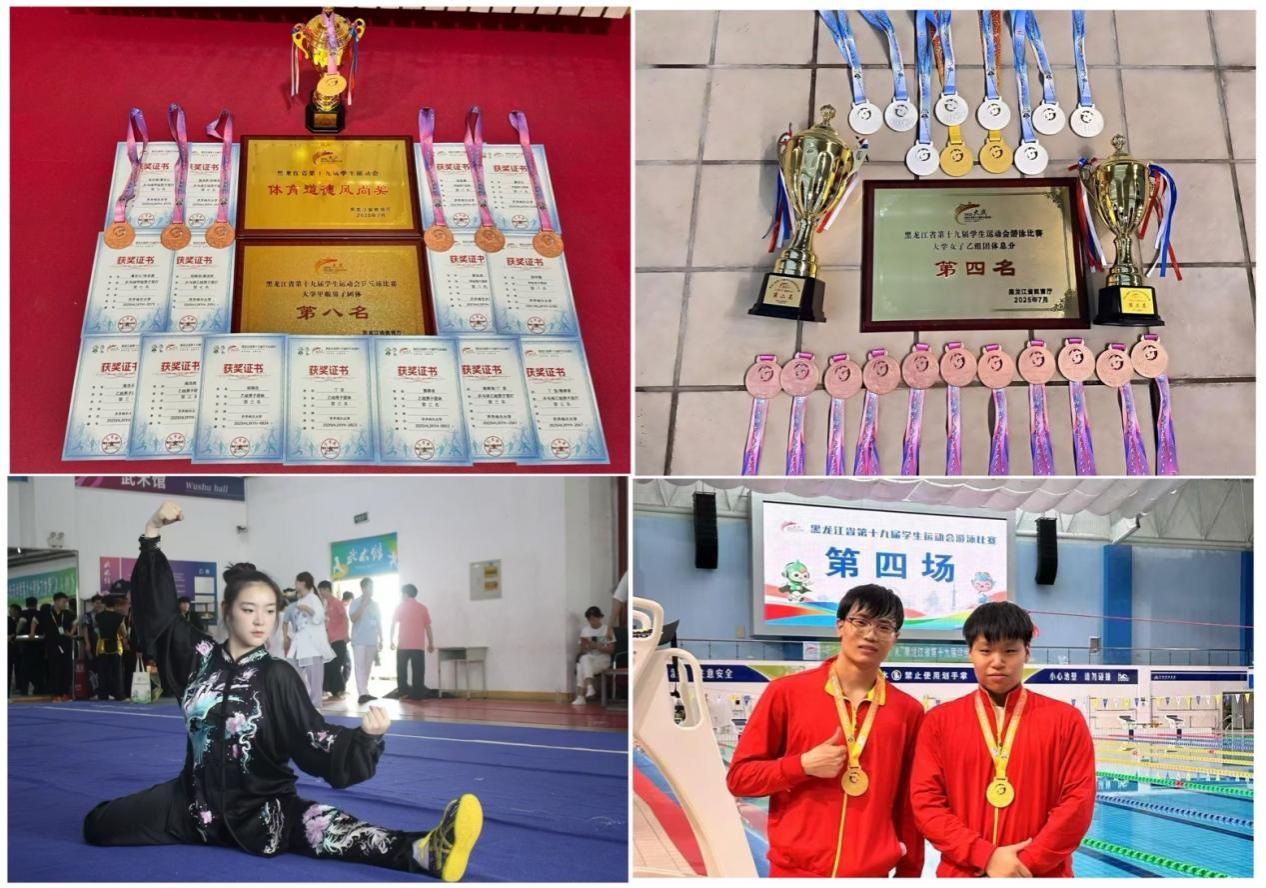 7月15日至25日,黑龙江省第十九届学生运动会在大庆市举行。本届运动会设高校组、地市组两大板块,我校选派100名师生组成代表团,在游泳、武术、乒乓球、羽毛球、网球、排球、健美操、田径八个项目中展开激烈角逐。经过十天激烈比拼,我校运动员凭借出色发挥和顽强拼搏,最终获得8金、15银、18铜,总计41枚奖牌,大学乙组团体总分第三名的优异战绩。