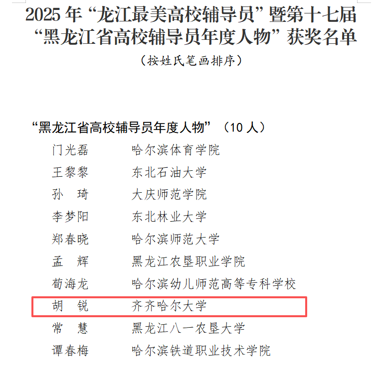 近日,2025年“龙江最美高校辅导员”推选展示活动暨第十七届“黑龙江省高校辅导员年度人物”评选结果正式公布。我校教师教育学院辅导员胡锐凭借其卓越的工作实绩、深厚的育人情怀脱颖而出,荣获“黑龙江省高校辅导员年度人物”称号。