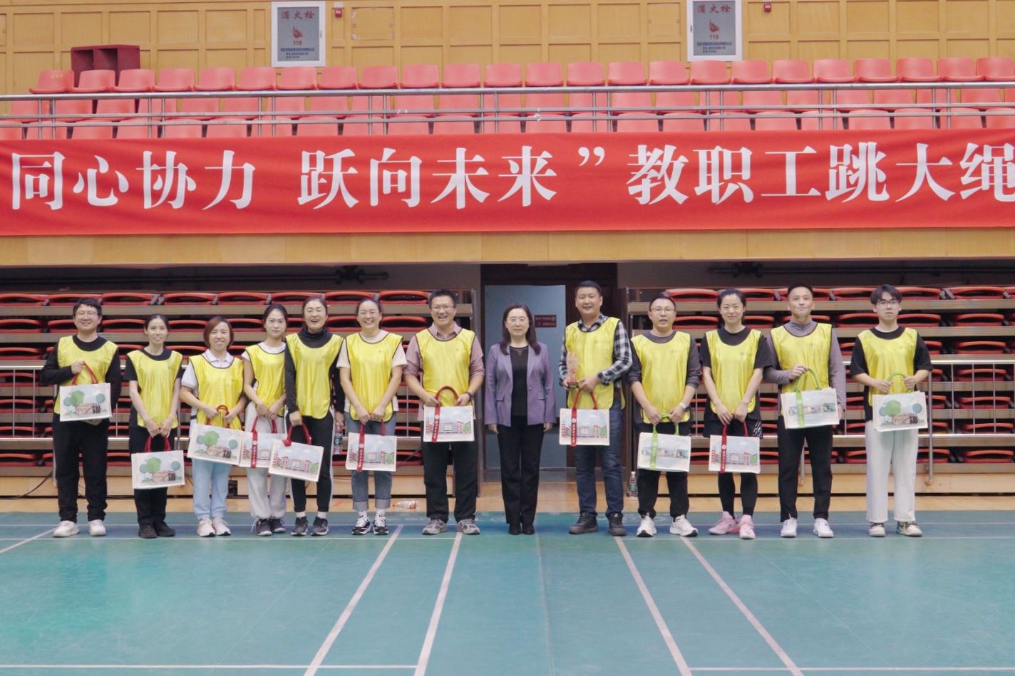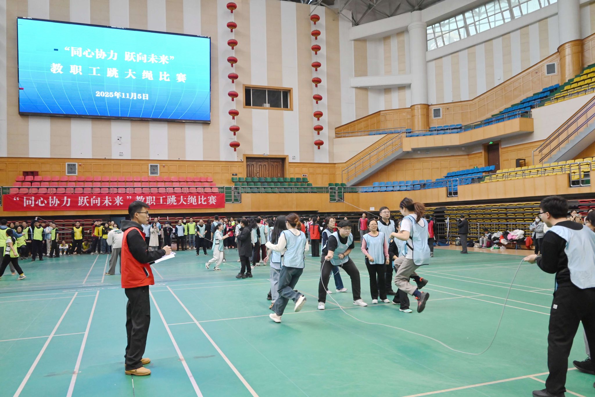 11月5日下午,西区体育馆内掌声雷动、欢声阵阵,由校工会主办的“同心协力 跃向未来”2025年教职工跳大绳比赛在这里火热举行。本次比赛共吸引了全校19个基层工会的21支代表队参赛,各参赛队伍在赛场上展现了卓越的团队协作精神和昂扬向上的风貌。