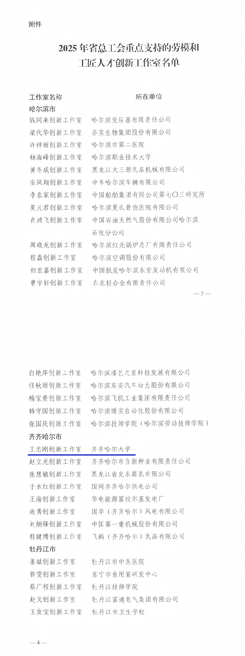 近日,黑龙江省总工会办公室印发《关于2025年黑龙江省总工会重点支持的劳模和工匠人才创新工作室的通报》(黑工办发〔2025〕第14期),正式公布2025年度全省重点支持的100家劳模和工匠人才创新工作室名单,我校“王志刚创新工作室”成功入选。