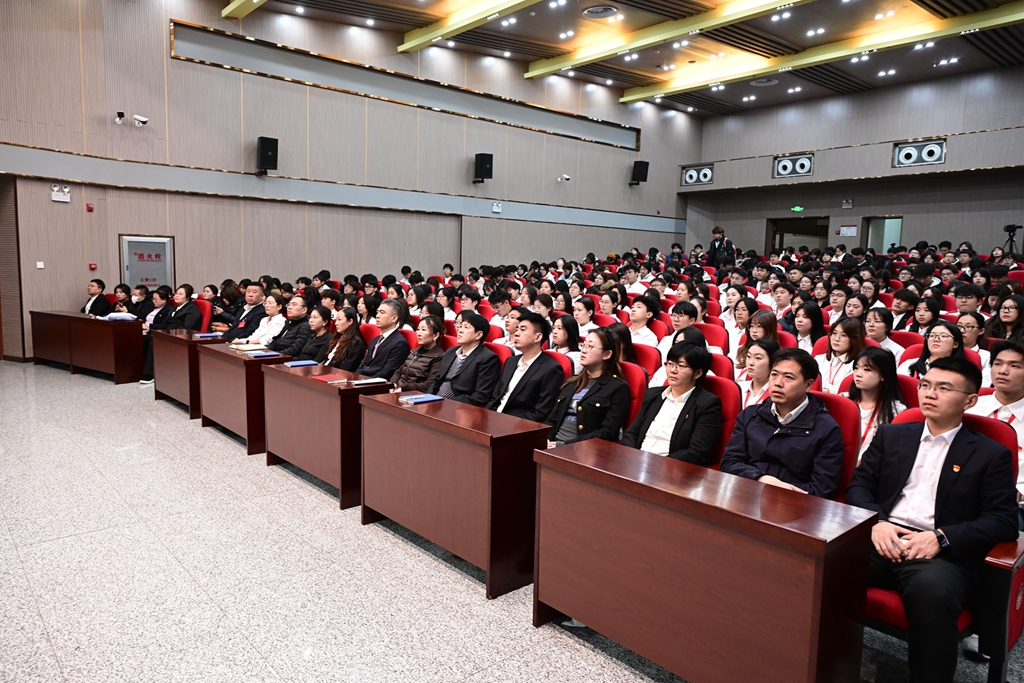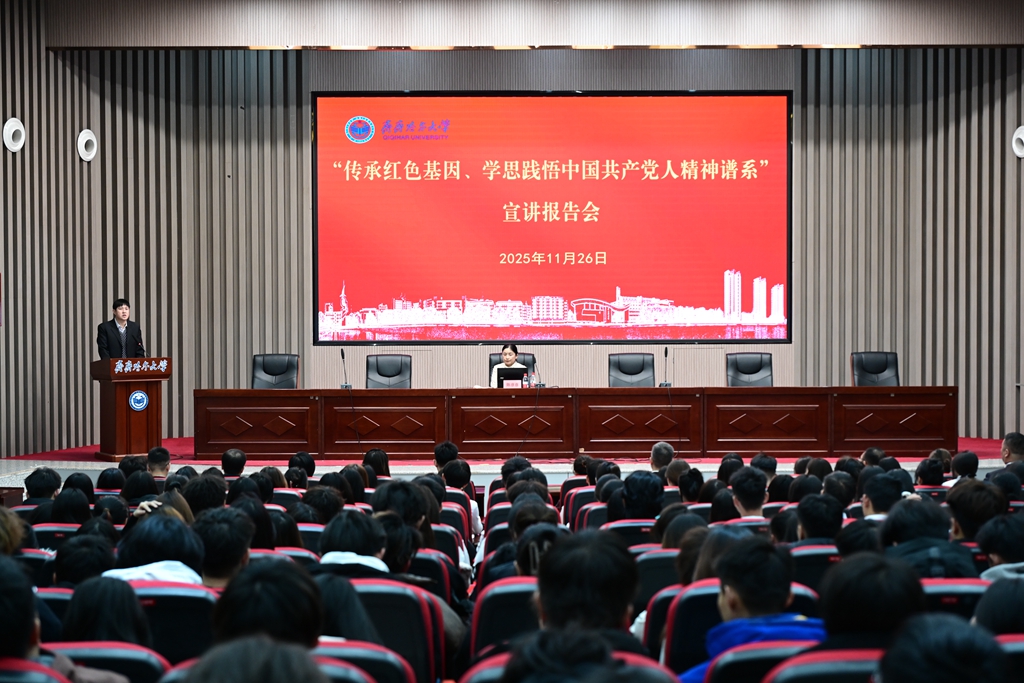 为深入学习贯彻党的二十届四中全会精神和习近平总书记关于教育的重要论述,按照教育部办公厅、省教育厅相关要求和学校党委工作部署,11月26日下午,由学校党委宣传部和校团委联合主办的“传承红色基因、学思践悟中国共产党人精神谱系”宣讲报告会在日新大厦四楼学术报告厅举行。校党委副书记、工会主席齐宏伟出席报告会,党委常委、宣传部部长杜海权主持会议。校团委相关负责人,各学院团委书记、宣传部全体工作人员、校院两级“青马工程”学员代表近400余人参加报告会。