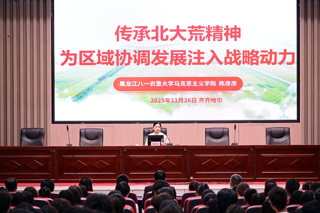 宣讲报告会由全国高校“中国共产党人精神谱系”宣讲团成员、黑龙江省北大荒精神学术交流基地主任、黑龙江八一农垦大学马克思主义学院院长、北大荒精神与文化研究所所长陈彦彦主讲。她以《传承北大荒精神,为区域协调发展注入战略动力》为题,通过大量的历史照片、详实的数据资料和生动的语言,深情讲述了北大荒开发建设的辉煌历程与艰苦卓绝的奋斗史诗,深度解读了北大荒人勇于开拓、执着坚守、赤诚奉献的情怀与担当,系统梳理了北大荒精神从形成、发展到不断丰富的演进脉络,深刻诠释了以“自力更生、艰苦创业、勇于开拓、甘于奉献”为主要内涵的北大荒精神。宣讲报告内容丰富、视野宏阔、论述精辟、感染力强,既有理论阐释、又有感人事迹,既有思想深度、又有教育温度,对全校广大党员、干部、师生更好地传承红色基因、赓续红色血脉具有很强的示范性、指导性和启发性。