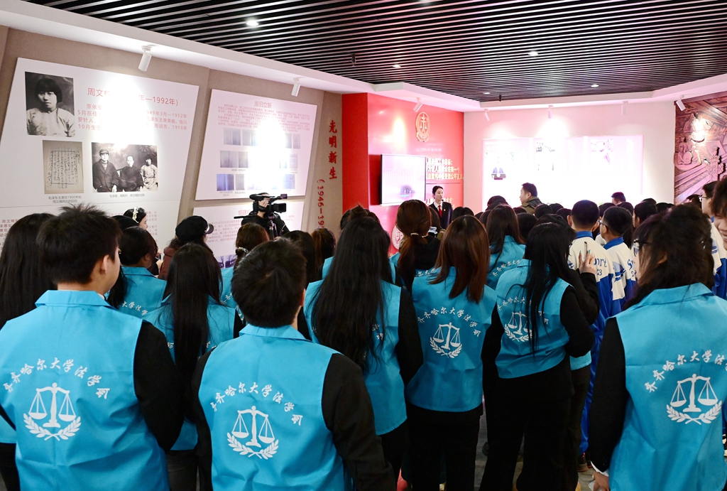 在齐齐哈尔市中院院史馆,一幅幅历史图片、一件件珍贵实物、一段段文字记载,生动展现了人民司法事业的光辉历程和本地法院的发展足迹。同学们跟随讲解员凝神驻足,聆听讲解,共同回顾我国法治建设的艰辛与荣光,体悟法治精神的磅礴力量。