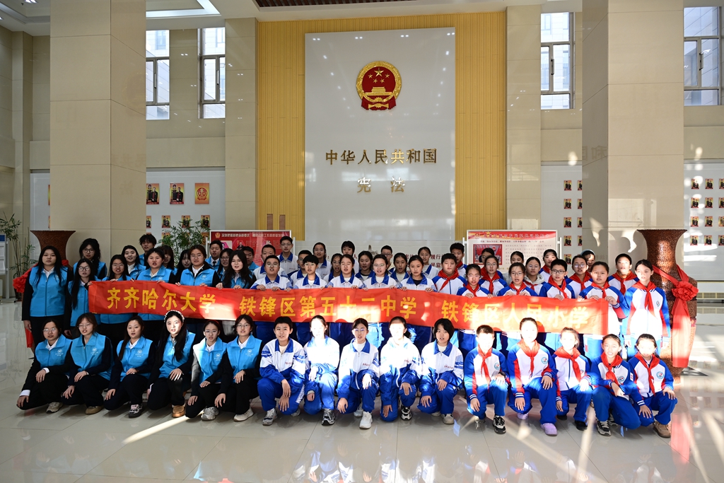 为迎接第十二个国家宪法日,大力弘扬宪法精神,深化大中小学法治教育一体化建设,12月3日下午,我校学生代表和铁锋区第五十二中学校、铁锋区人民小学校的学生代表一同走进齐齐哈尔市中级人民法院,开展“跨龄同行学宪法 法治护航青春路”主题普法宣传活动,通过“行走的法治课堂”开启沉浸式普法体验。校党委常委、宣传部部长杜海权及宣传部相关工作人员、相关学院教师参加活动。