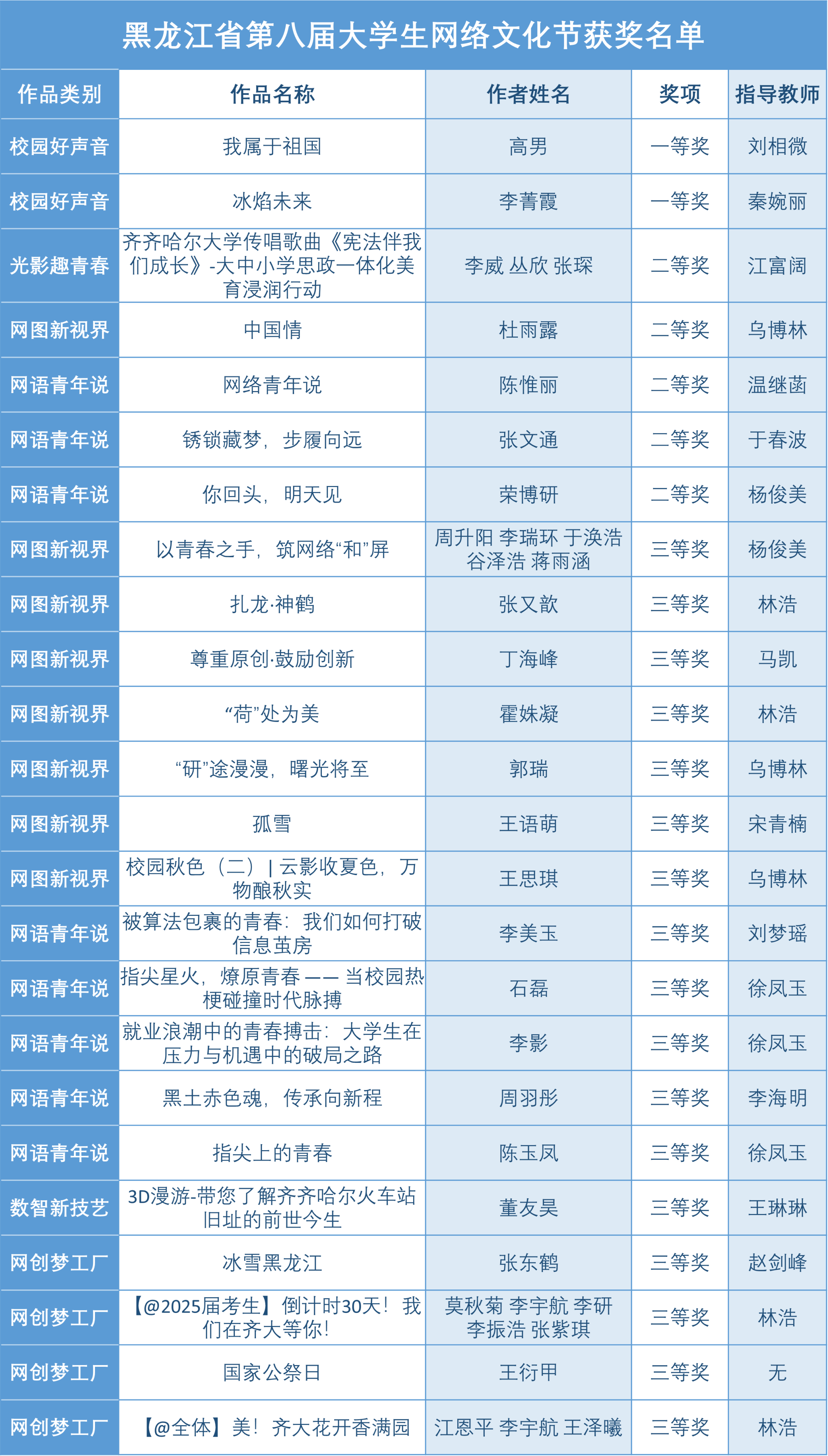 近日,由省委教育工委、省委网信办联合举办的“第八届黑龙江省大学生网络文化节”评选结果揭晓,我校推荐的24项作品斩获佳绩,获奖作品均被推荐参加第八届全国大学生网络文化节评选。