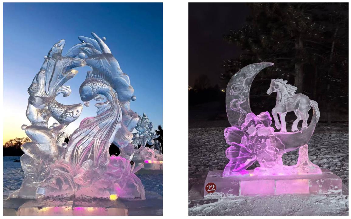 2025年12月27日,第二十三届黑龙江省大学生冰雕比赛在哈尔滨兆麟公园落下帷幕。全省50支高校代表队近百名师生参赛,我校学生作品《照日生红暖见鱼》获得制作类二等奖,《凤凰游》获得设计类二等奖。