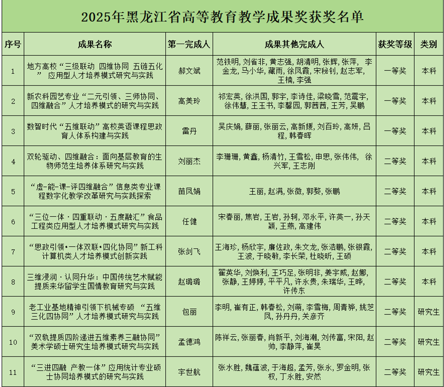 近日,黑龙江省教育厅对2025年黑龙江省高等教育教学成果奖拟授奖成果名单进行了公示。学校在此次评选中再创佳绩,共荣获11个奖项,其中一等奖3项、二等奖8项,获奖数量取得历史性突破。这一成绩不仅彰显了学校在教育教学改革领域的深厚积淀,更凸显了学校在人才培养质量提升方面的显著成效。