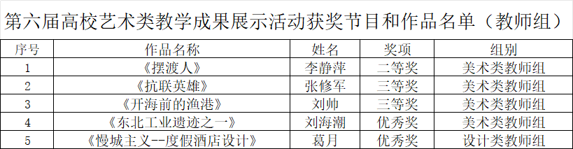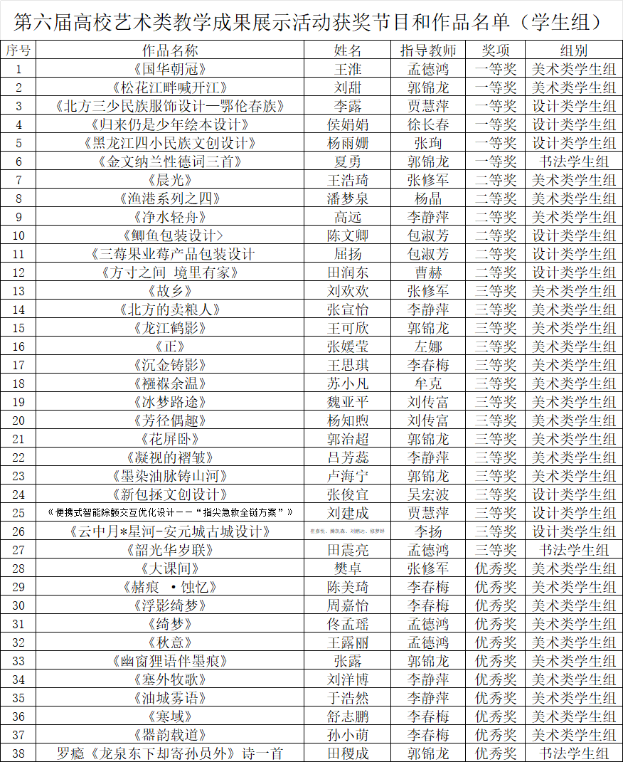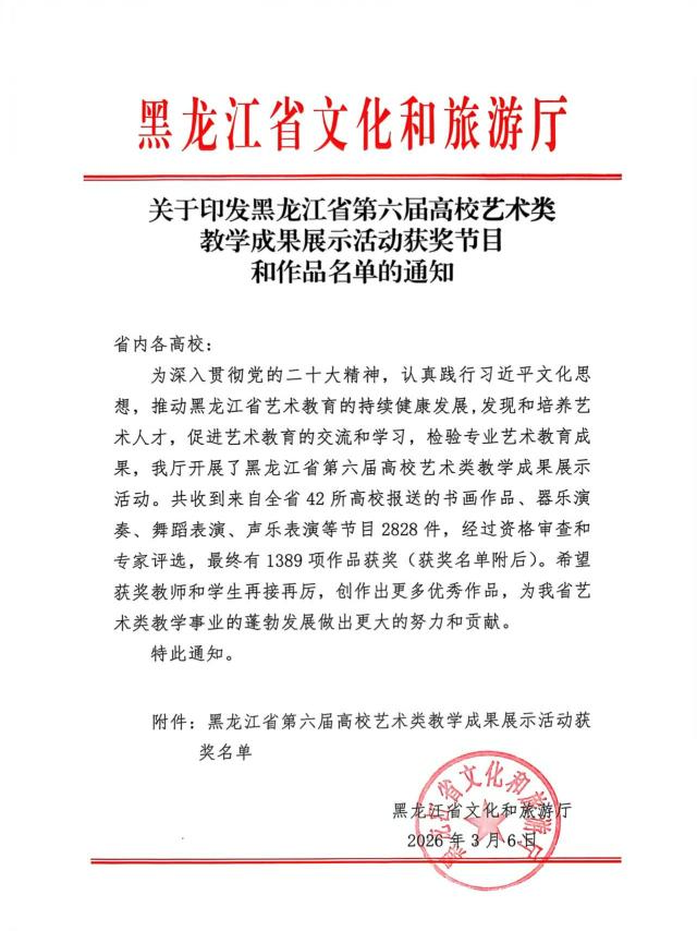 近日,黑龙江省文化和旅游厅公布了黑龙江省第六届高校艺术类教学成果展示活动的获奖节目与作品名单。我校师生在此次活动中表现优异,再创佳绩:教师组获奖5项,学生组获奖38项。据悉,本次活动全省共有42所高校参与,报送师生作品2828件,最终1389件作品获奖。