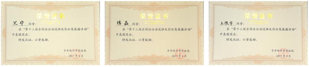 4月11日,因在“第十三届全国法治动漫微电影征集展播活动”中表现突出,我校兰宁、杨磊、王振宇等17名同学,杨超、陈光、王世发3位指导教师获齐齐哈尔市司法局表彰。