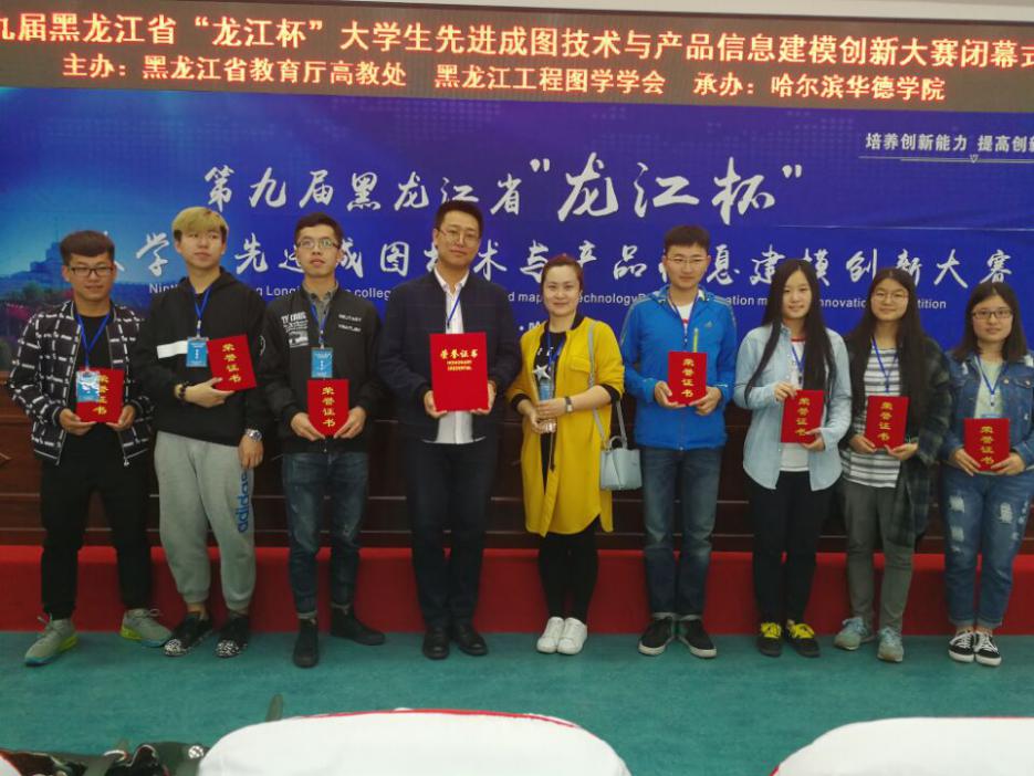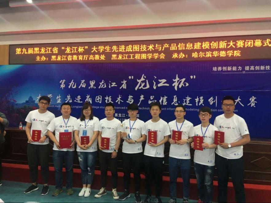 2017年6月3日,第九届黑龙江省"龙江杯"大学生先进成图技术与产品信息建模创新大赛在哈尔滨华德学院圆满落幕。大赛由黑龙江省教育厅高教处和黑龙江工程图学学会共主办,共分机械类和建筑类两类竞赛。我校机械类代表队荣获团体一等奖1项、个人全能一等奖7项,建筑类代表队荣获团体二等奖1项、个人单项一等奖1项、二等奖6项。