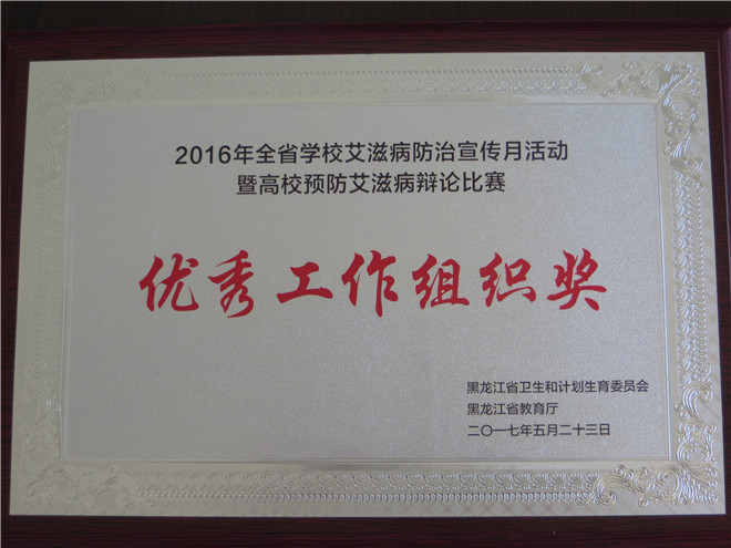 2017年5月23日,在黑龙江省卫生和计划生育委员会与省教育厅联合举办的2016年高校预防艾滋病辩论赛总结和表彰会上,我校荣获2016年全省学校艾滋病防治宣传月活动暨高校预防艾滋病辩论比赛优秀工作组织奖。