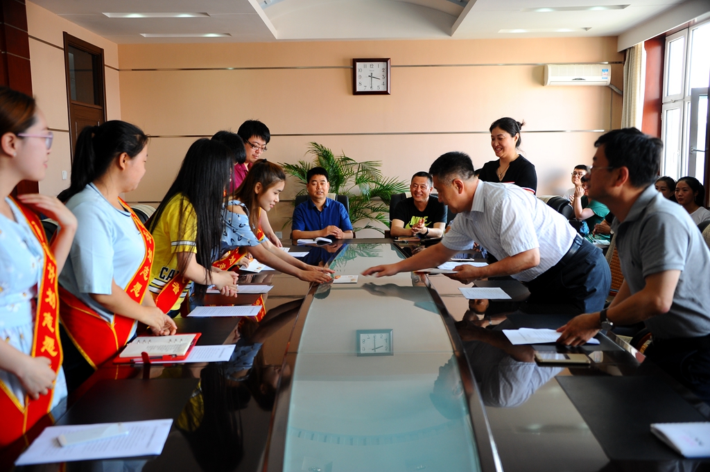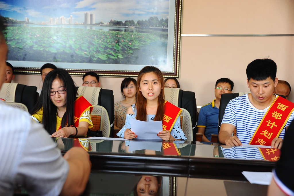 欢送会上,志愿者代表张竞尹用朴实的语言表达了志愿服务西部的决心和对母校深深的眷恋。她认为参加西部计划是一项光荣的使命,是一次将奉献国家与实现自我价值完美结合的宝贵经历,志愿者服务西部也是一次挑战,一次考验,一次磨砺。马上要开始新的征程了,我们会铭记母校的培养和嘱托,踏踏实实地在平凡的岗位上工作,以”踏实敬业”的齐大毕业生精神谱写不平凡的青春之歌。大学生志愿者分别发言,纷纷表达了奉献西部,为母校争光的决心。