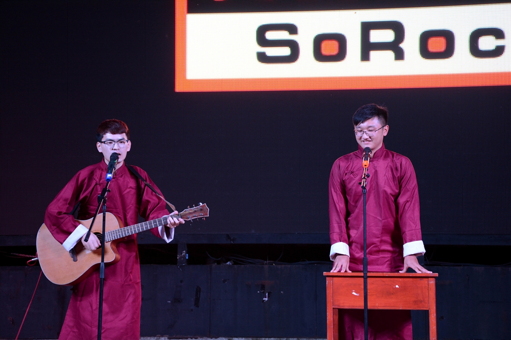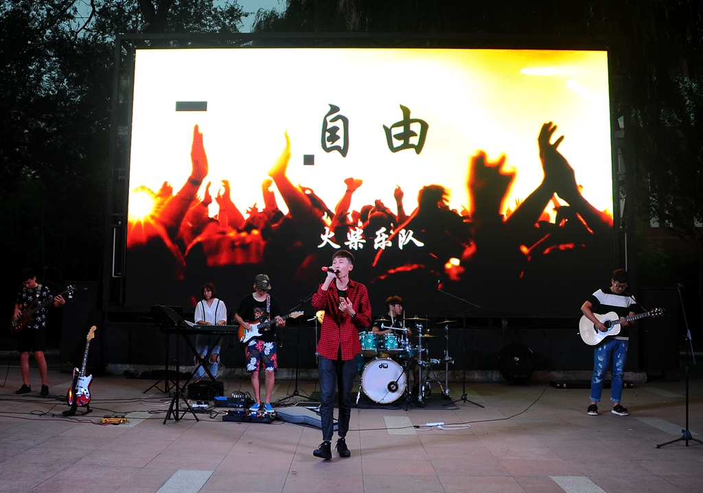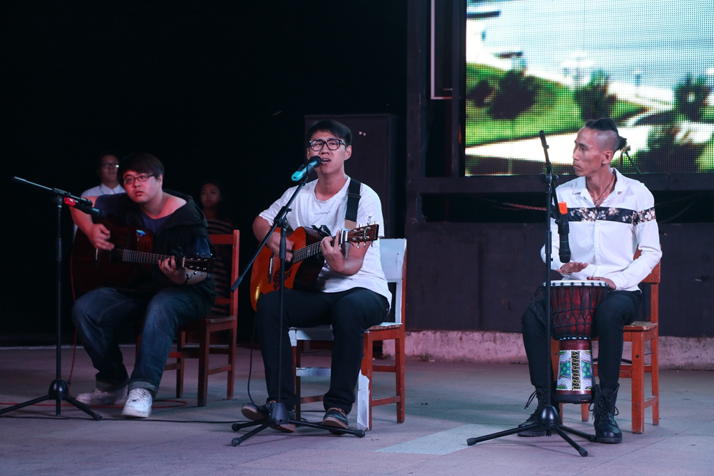 张思远等组成的火柴乐队火爆开场,在重金属和强劲节奏感的撞击下,演唱的歌曲《自由》、《不归路》和《长安夜》完美地诠释了这个意义。震撼人心的表演,点燃了台下观众的热情,动感的音乐告诉2017级的学弟学妹们,既然选择远方,便不惧任何阻挡。