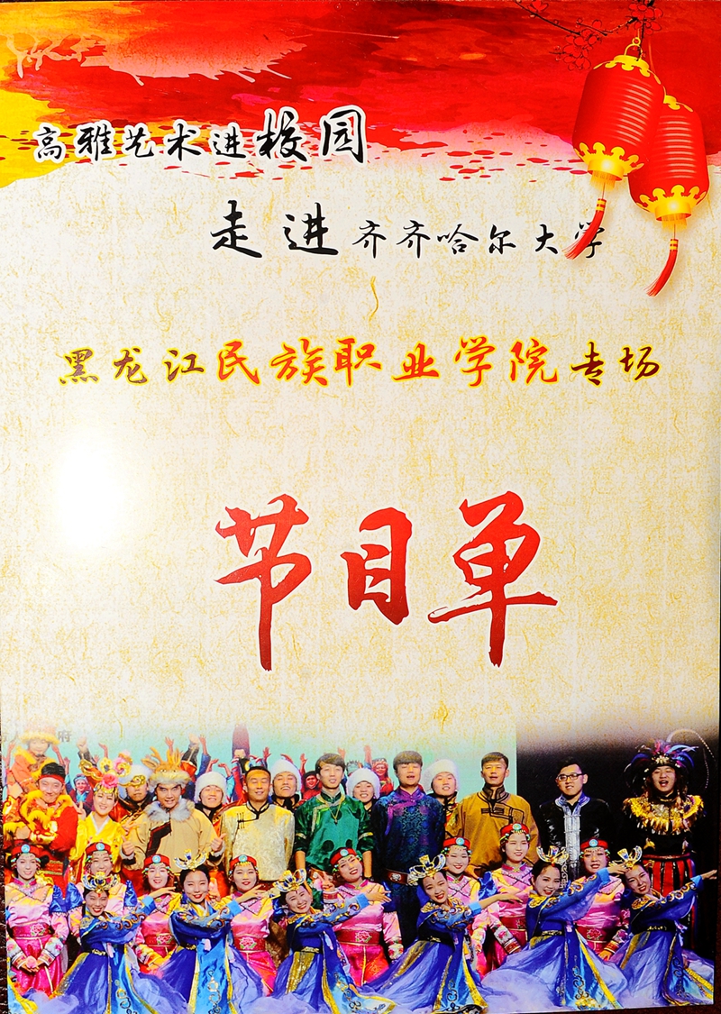 11月2日18:30,2017“高雅艺术进校园”——黑龙江民族职业学院走进齐齐哈尔大学专场演出在我校文化宫举办。黑龙江民族职业学院艺术与传媒系副主任何苗带领70余名师生,为我校师生送来了一场极富东北地方民族特色的艺术盛宴。学生工作部(学生处)部(处)长姜波,音乐与舞蹈学院院长孙相根,校党委宣传统战部副部长孟宪国、何强,音乐与舞蹈学院副院长包明德与我校1300余名师生共同观赏了演出。