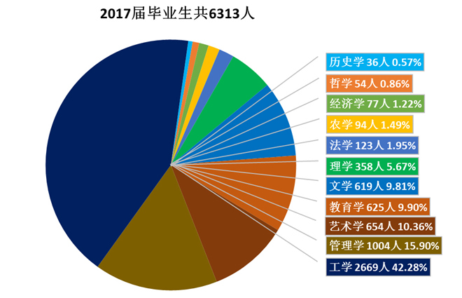 我校2017届毕业生就业基本情况。2017届本科毕业生共计6313人,其中男生2907人,占比46.05%。女生3406人,占比53.95%。男女生之比为0.85:1。涵盖工学等11个学科门类,生源分布以黑龙江省为主,包括31个省(自治区、直辖市)。我校2017届毕业生的初次就业率为90.1%,年终就业率为94.0%,初期就业率相比去年同期上升了2.36个百分点。2017届毕业生的就业结构是签约就业、升学、出国、灵活就业和待就业。就业行业主要为教育、信息技术、制造业、科学研究为主。