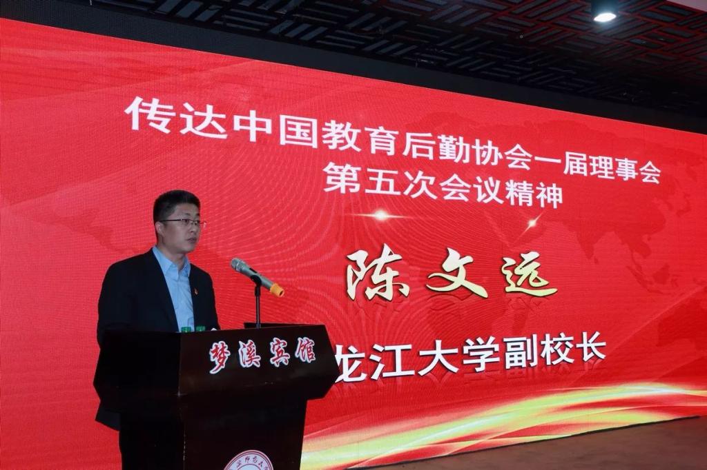 会上,黑龙江大学副校长陈文远同志传达了中国教育后勤协会一届理事会第五次会议精神,明确围绕“学习新思想、牢记新使命、展示新作为、塑造新气象”的会议主旨,履职尽责、牢记使命、积极探索,开启教育后勤改革创新的新局面。