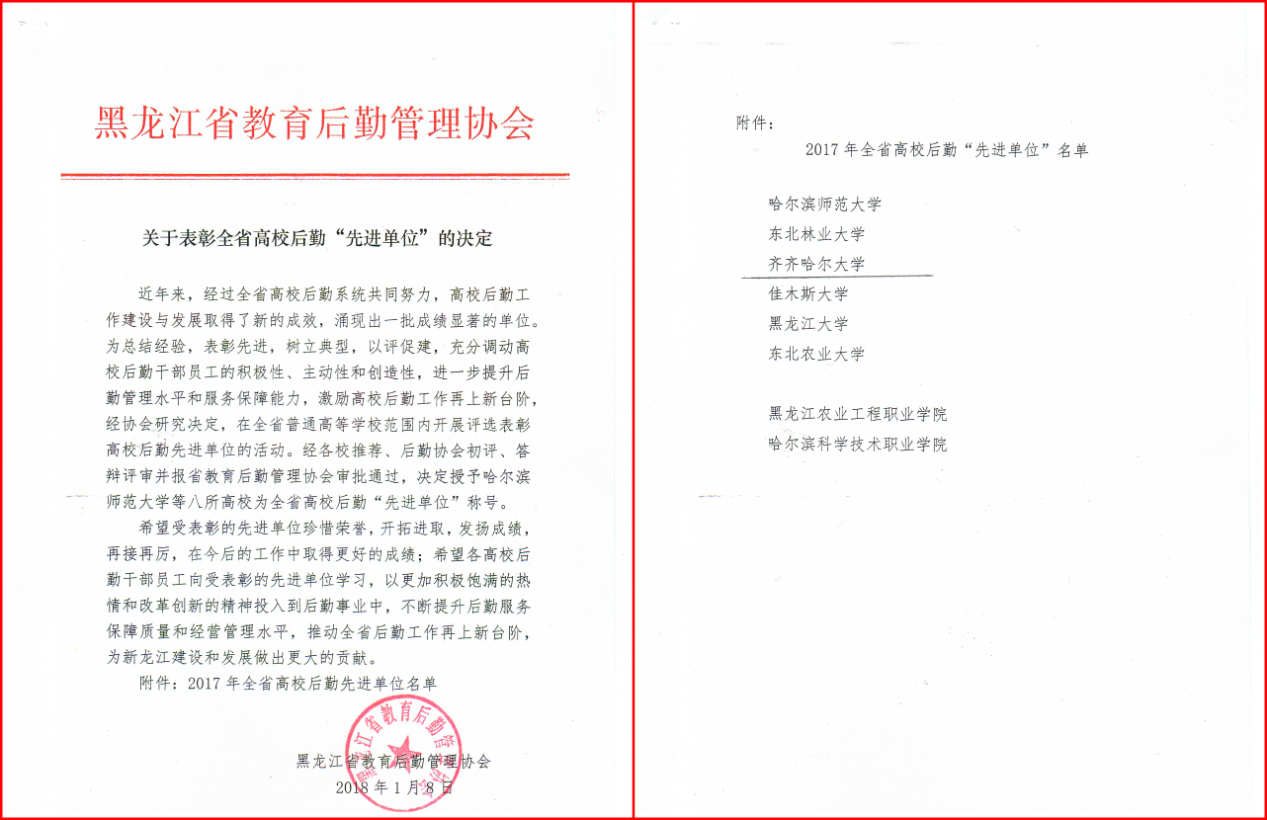 多年来,我校后勤管理处全体后勤干部职工秉承“团结、奉献、节俭、创新”的精神,以基层党支部和职工队伍建设为重点,以服务教学科研为中心,积极开展形式多样的各项活动,全面提高了干部党员职工的综合素质,为学校的人才培养,科学研究,服务社会及文化传承与创新提供了有力的服务保障,深受全校广大师生员工的肯定和好评。2014年9月,后勤管理处荣获了黑龙江省人力资源和社会保障厅、黑龙江省教育厅授予的全省教育系统先进集体荣誉称号;2015年10月,荣获了学校2013——2015年“三育人”工作先进集体荣誉称号;2015年12月,后勤党委荣获了学校党委授予的“美食节”“首届校园十大美食”活动创新奖。后勤管理处将以党的十九大精神为引领,在新时代展现新作为,继续发扬爱岗敬业、无私奉献、努力拼搏、勇于进取的精神,为建设人民满意大学做出新的更大的贡献。