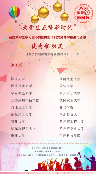 近日,由教育部思想政治工作司指导,中国大学生在线主办的“大学生点赞新时代”全国大学生学习宣传贯彻党的十九大精神网络接力活动已经圆满收官,我校在此次活动中获得优秀组织奖。