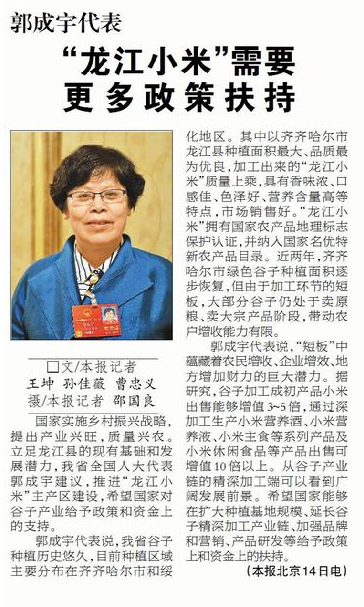 3月15日出版的《黑龙江日报》第7版“两会特刊”栏目中报道了我校全国人大代表郭成宇教授关于推进“龙江小米”主产区建设的建言。