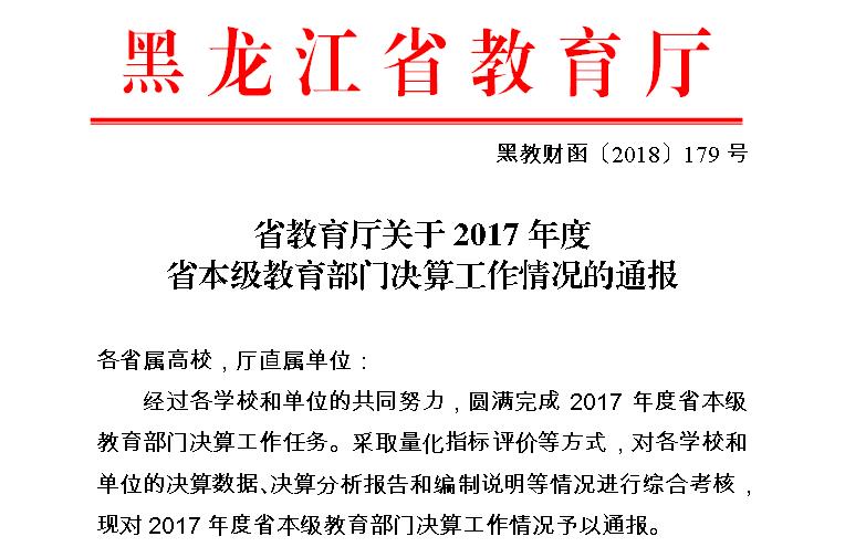 近日,省教育厅发布文件,对全省高校2017年决算工作情况进行了通报,并对先进单位和个人进行表扬,我校获得“2017年度决算工作先进单位”称号,同时还获得了“2017年度决算报表先进单位”“2017年度决算分析报告和编制说明先进单位”“2017年度资产报表填报先进单位”等三个单项工作荣誉,宁国祥、张月武、赵研等三名同志荣获先进个人荣誉称号。
