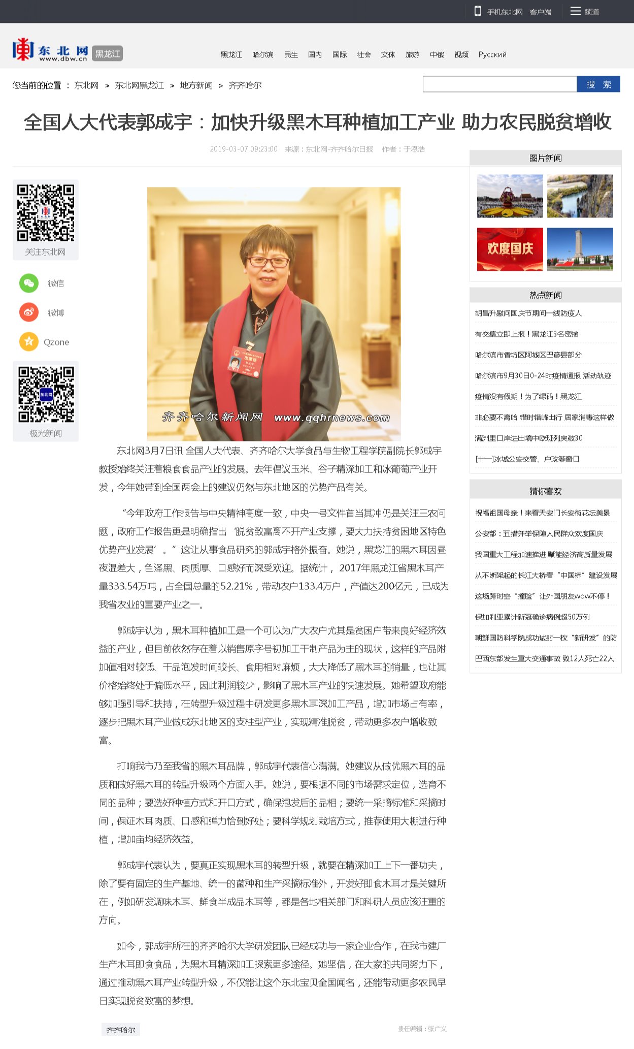 【东北网】全国人大代表郭成宇:加快升级黑木耳种植加工产业 助力农民脱贫增收