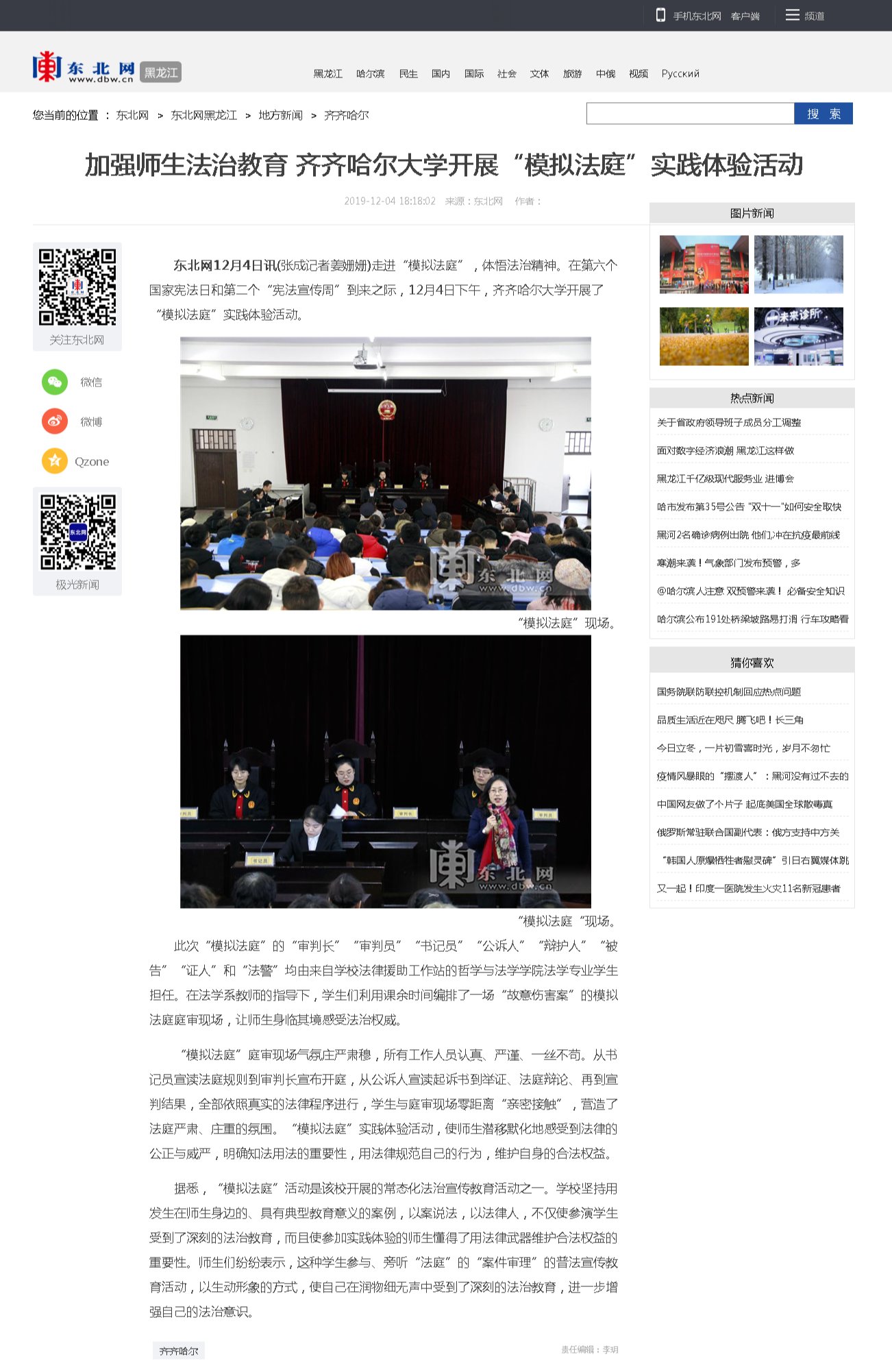 【东北网】加强师生法治教育 齐齐哈尔大学开展“模拟法庭”实践体验活动