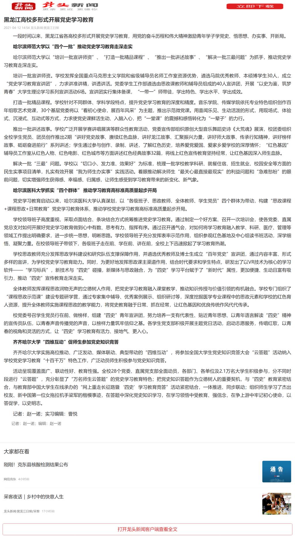 【黑龙江日报】黑龙江高校多形式开展党史学习教育