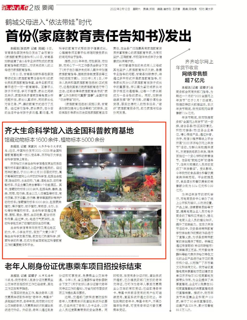 【齐齐哈尔日报】齐齐哈尔大学生命科学馆入选全国科普教育基地