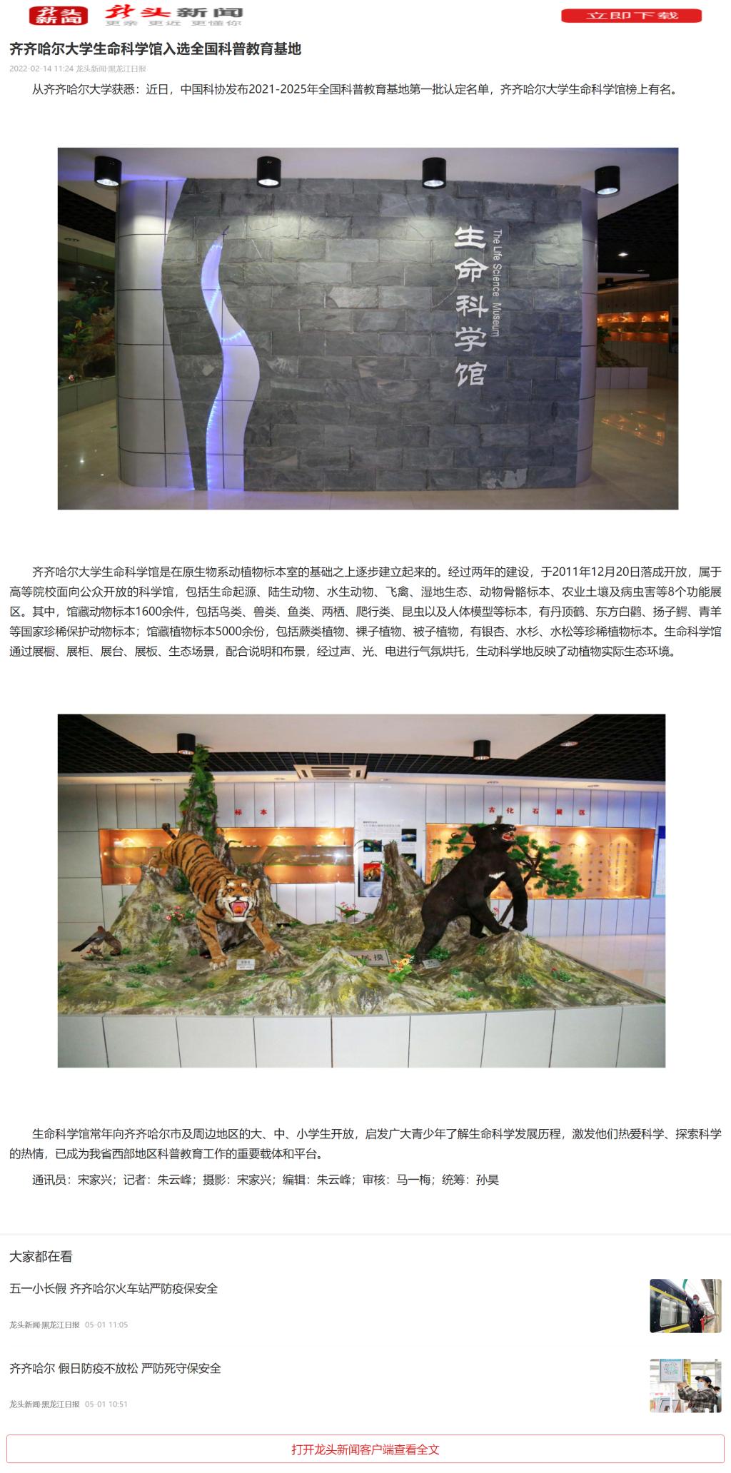 【龙头新闻】齐齐哈尔大学生命科学馆入选全国科普教育基地