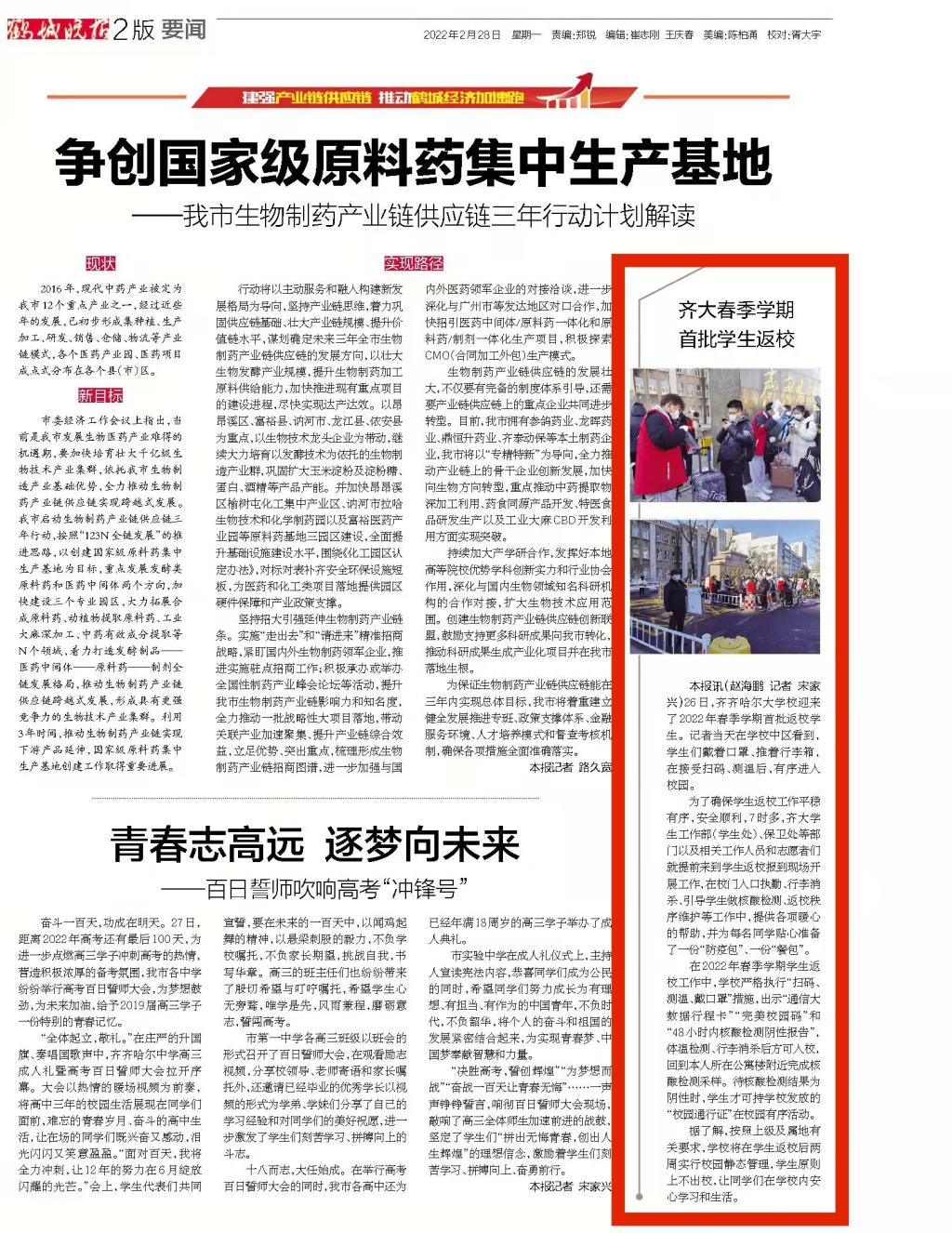 【鹤城晚报】齐大春季学期首批学生返校