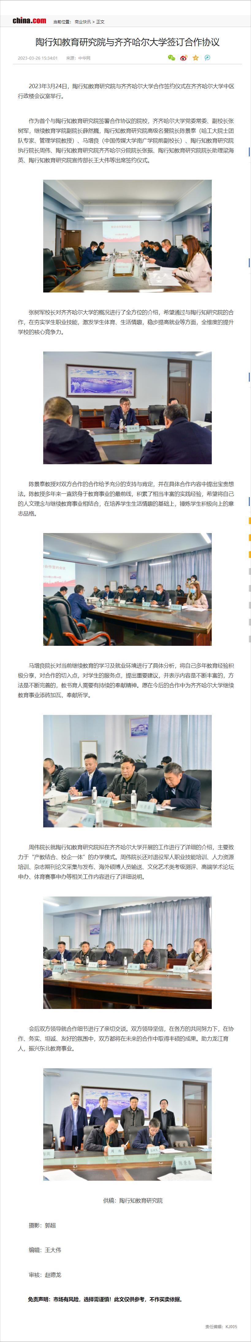 【中华网】陶行知教育研究院与齐齐哈尔大学签订合作协议