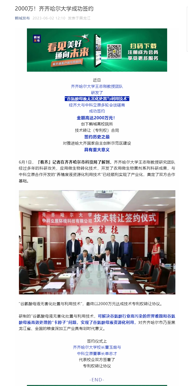 下一条:【齐齐哈尔市科技局】成果转化加速度|2000万!齐齐哈尔大学王志刚教授团队专利技术成功转让