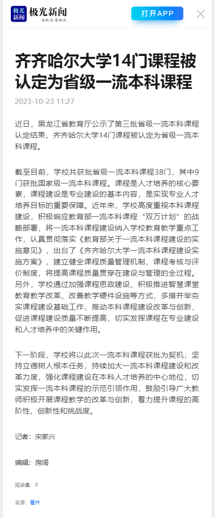 【极光新闻】齐齐哈尔大学14门课程被认定为省级一流本科课程