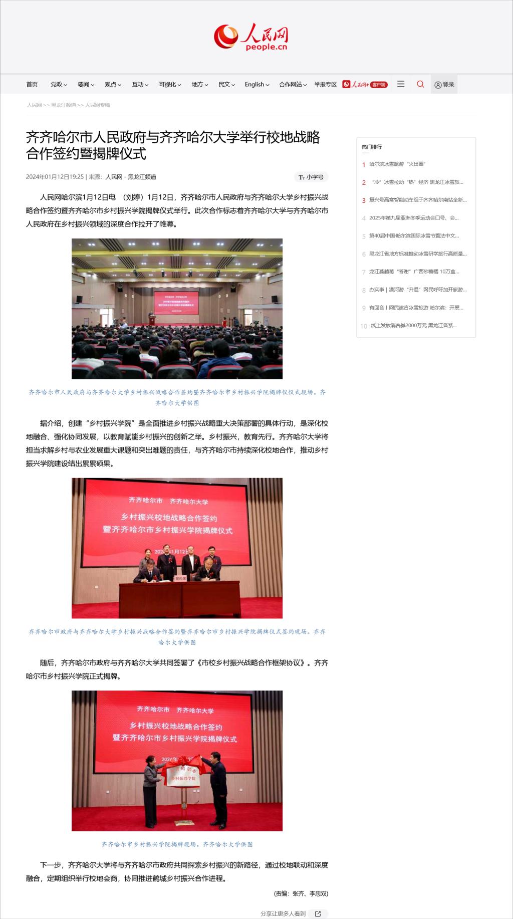 【人民网】齐齐哈尔市人民政府与齐齐哈尔大学举行校地战略合作签约暨揭牌仪式