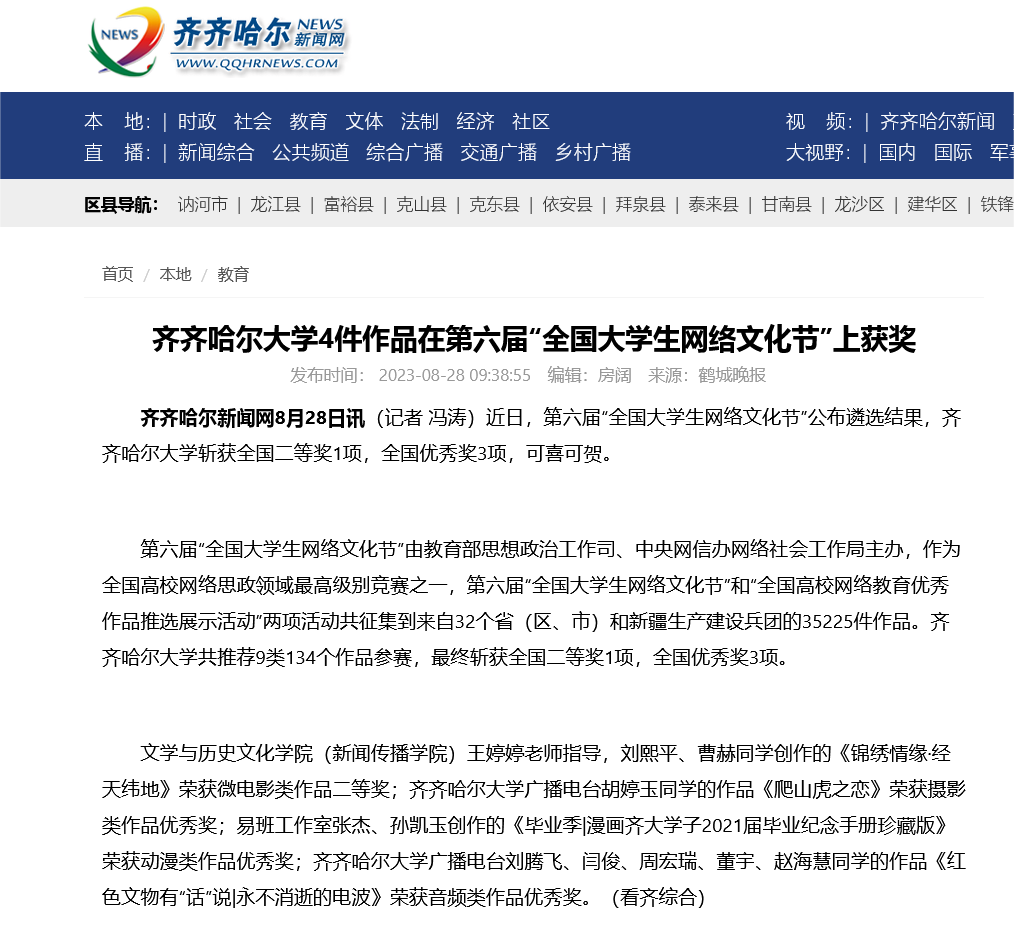 【齐齐哈尔新闻网】齐齐哈尔大学4件作品在第六届“全国大学生网络文化节”上获奖