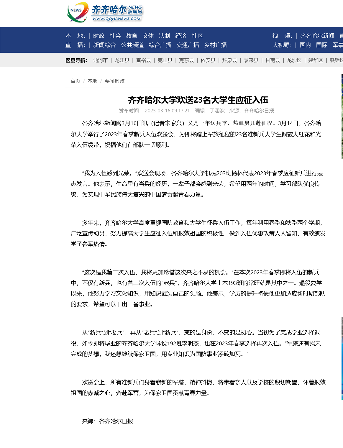 下一条:【鹤城晚报】送新兵 踏征程 齐齐哈尔大学欢送23名应征入伍准新兵大学生