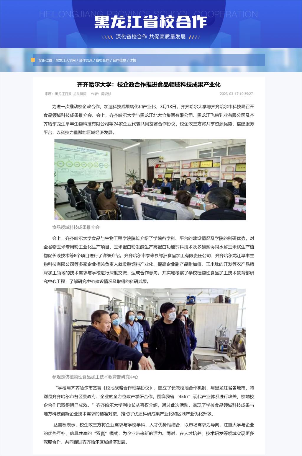 【黑龙江人才网】齐齐哈尔大学:校企政合作推进食品领域科技成果产业化