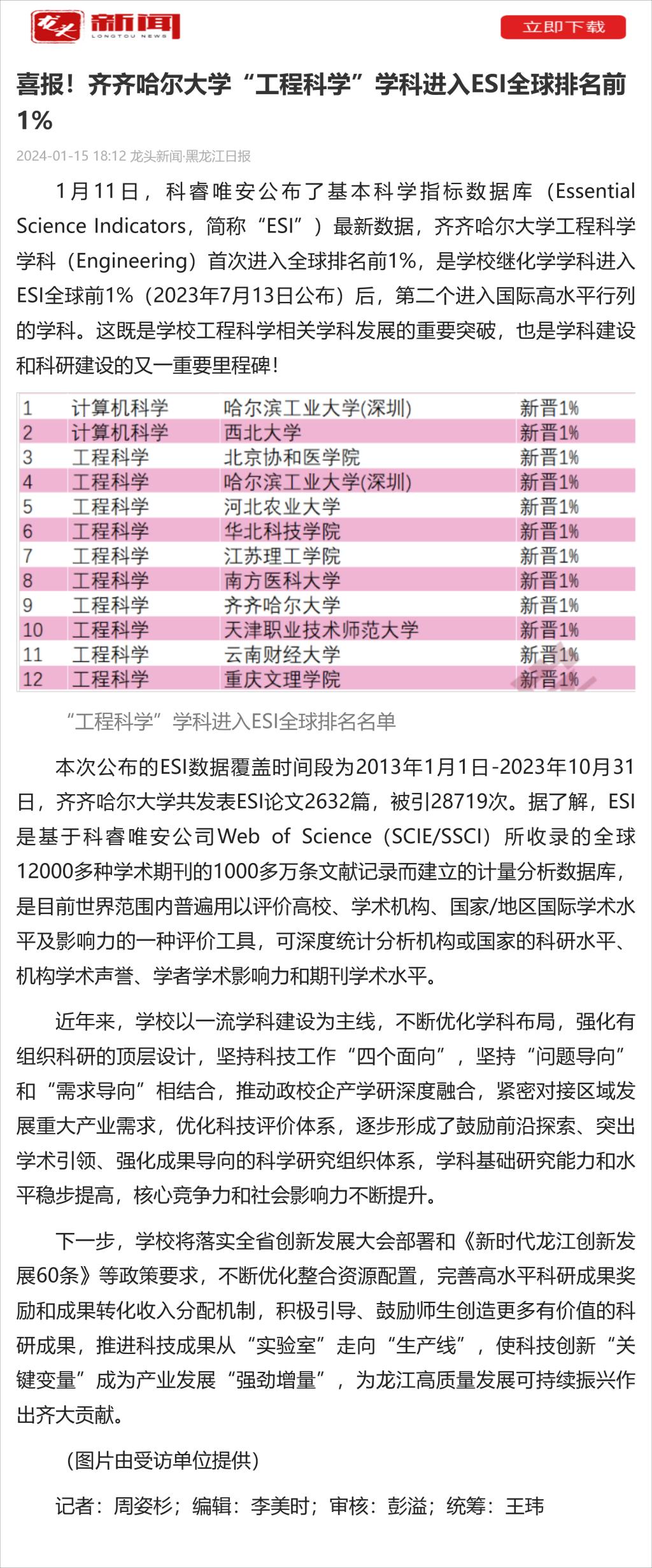 【龙头新闻】喜报!齐齐哈尔大学“工程科学”学科进入ESI全球排名前1%