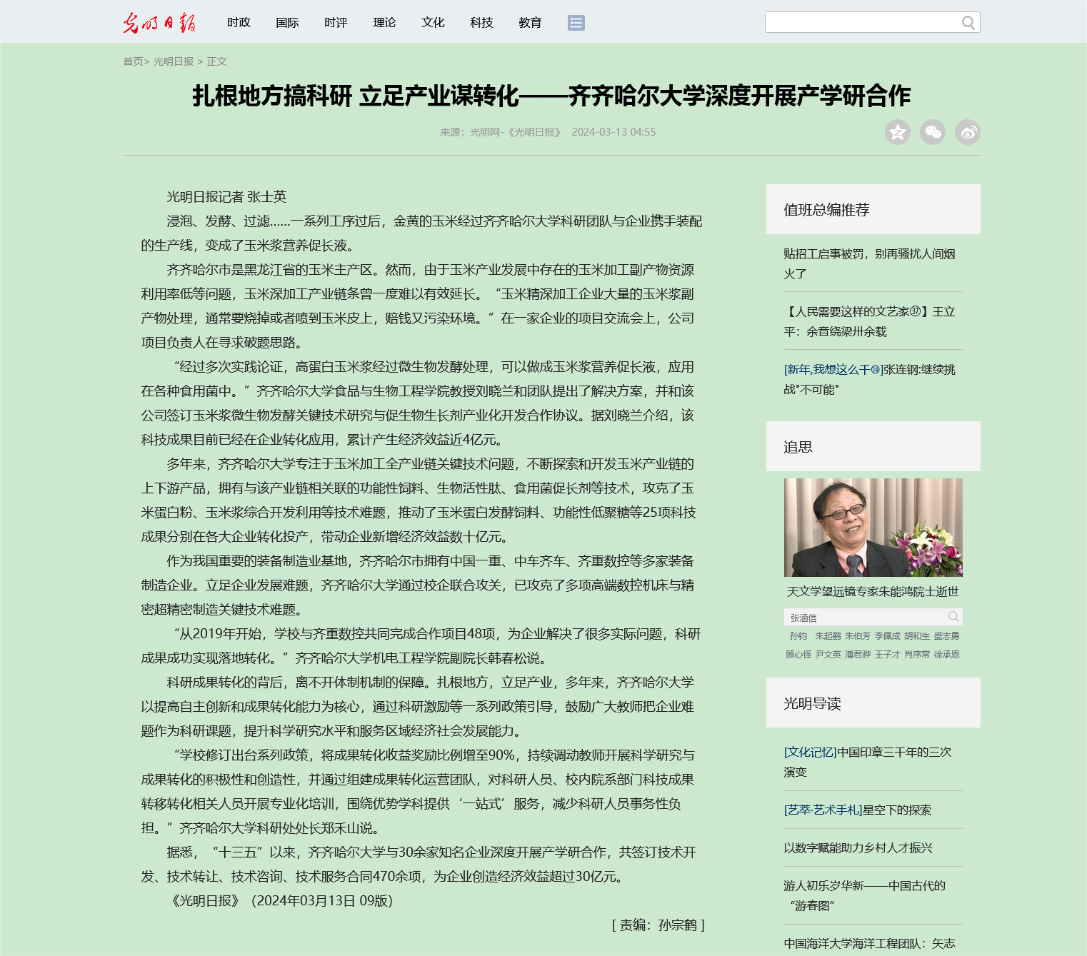 【光明日报】扎根地方搞科研 立足产业谋转化——齐齐哈尔大学深度开展产学研合作