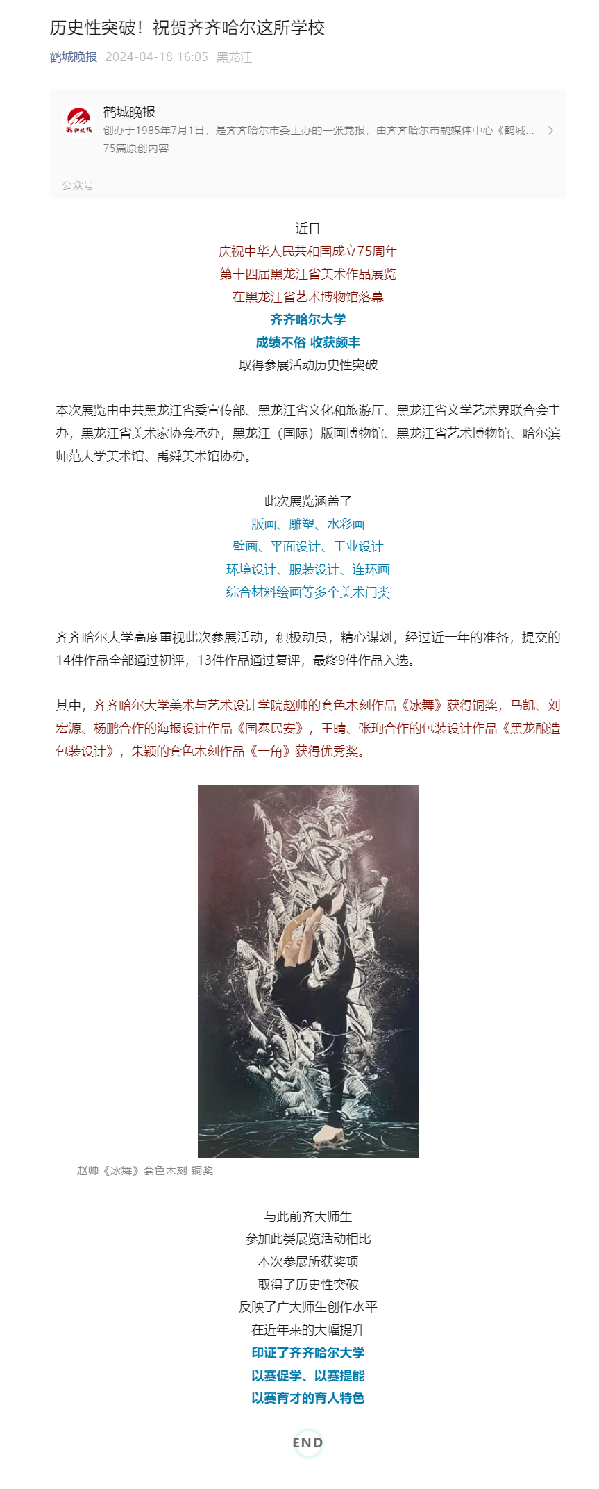 上一条:【齐齐哈尔新闻网】第十四届黑龙江省美术作品展览齐齐哈尔大学《冰舞》获铜奖