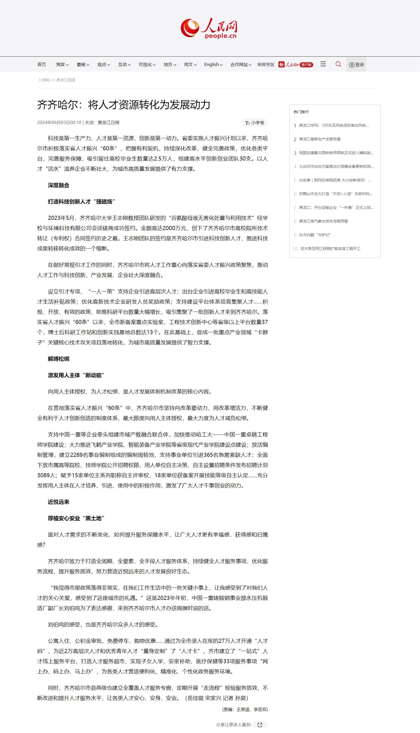 【人民网】齐齐哈尔:将人才资源转化为发展动力