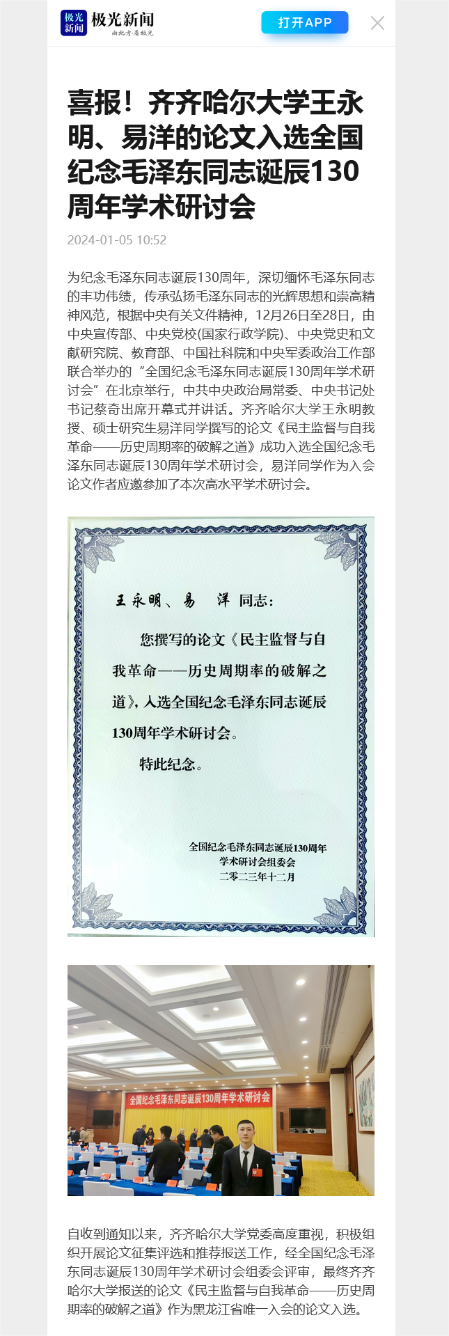 【极光新闻】喜报!齐齐哈尔大学王永明、易洋的论文入选全国纪念毛泽东同志诞辰130周年学术研讨会